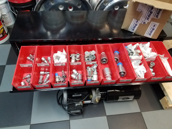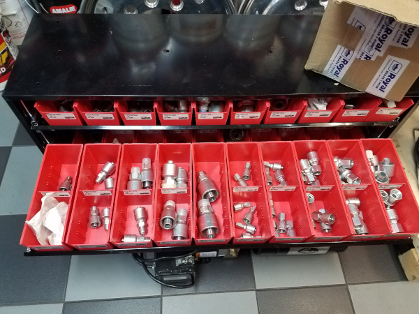 275-piece set of hose and fittings, includes the Gates 707 Crimper, cabinet and bins.